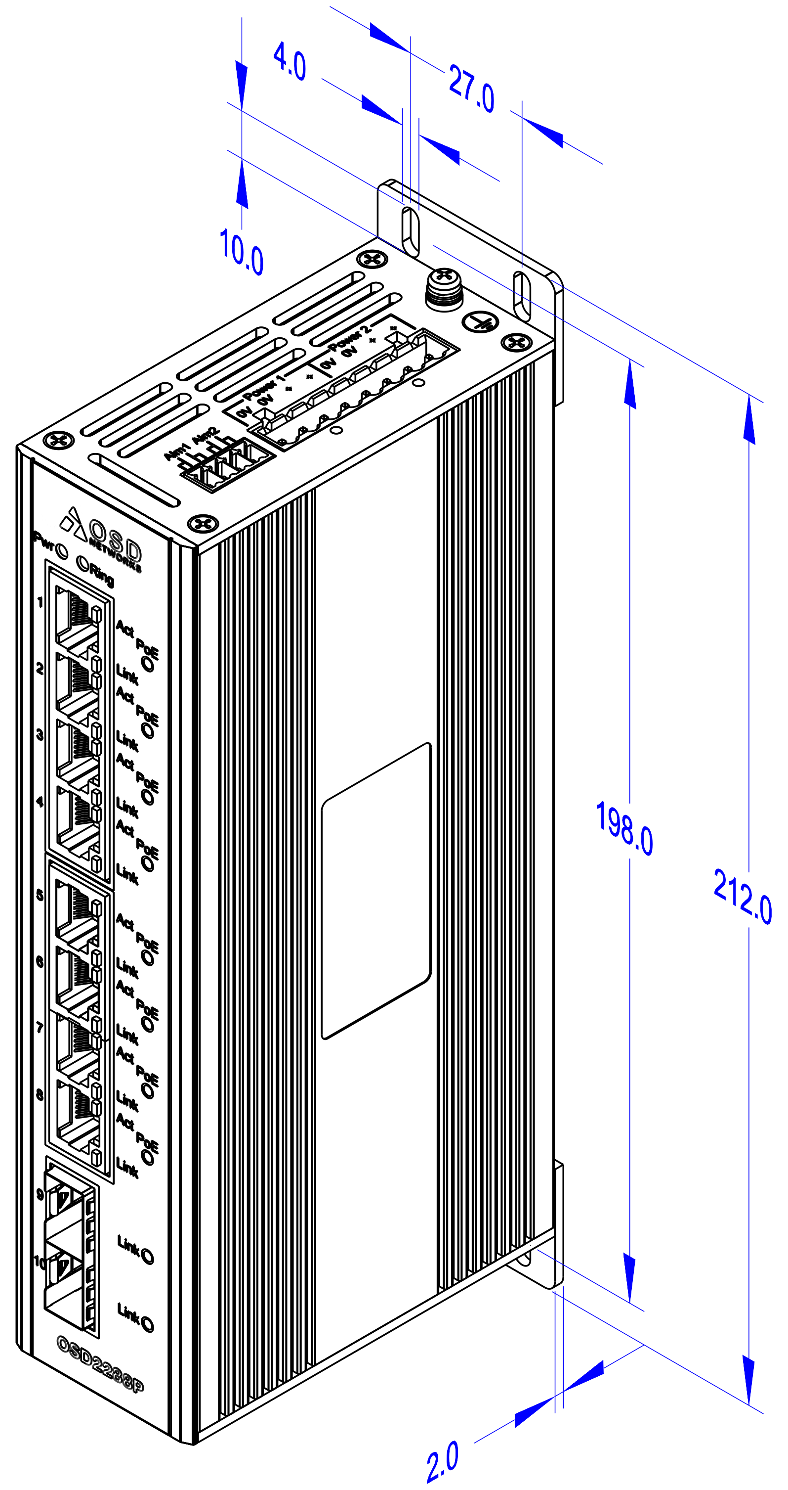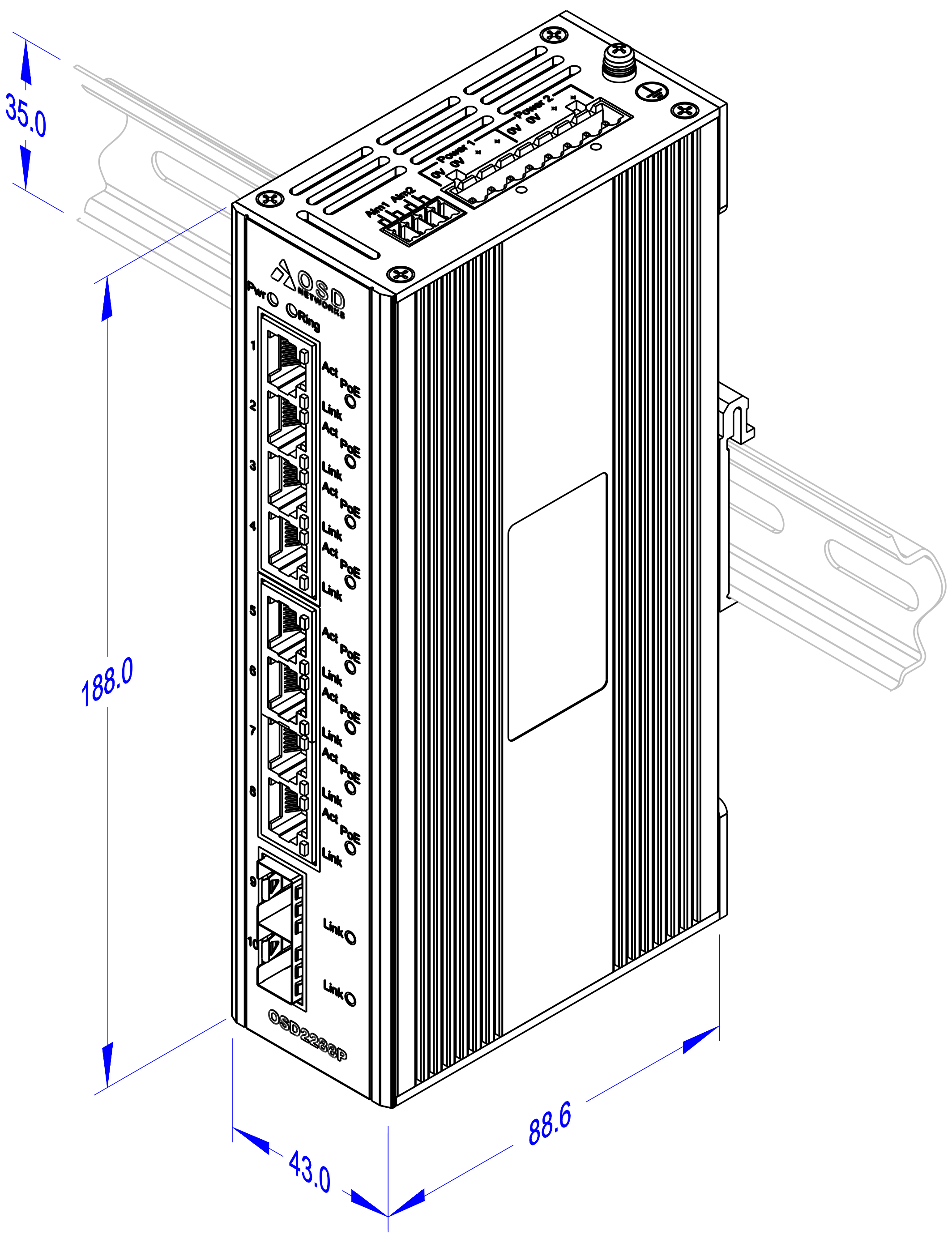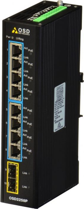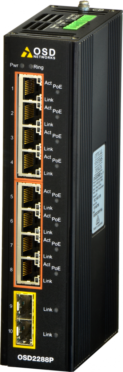 The OSD2288P is a 10-port lite managed industrial Ethernet switch with eight Gigabit RJ45 ports and two 1G/2.5G SFP uplink ports which can be used as standard LAN ports or as a redundant fiber ring using OSD’s proprietary ring protocol. Each RJ45 port can provide up to 90W PoE to power a wide range of devices. Along with higher level features including SNMP, VLAN and IGMP snooping the OSD2288P is suitable for use in critical networks. A rugged IP30 casing, fan-less design and wide operating temperature range from -40 to +75ºC make it suitable for use in a wide range of harsh industrial environments.